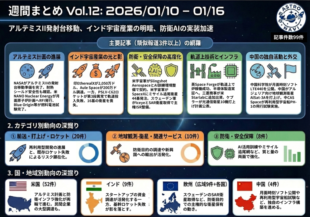 今週の宇宙・防衛分野は、米国主導の有人月探査計画「アルテミス」が実運用フェーズに向けて着実に前進する一方、新興宇宙大国インドではスタートアップ投資の活況と基幹ロケットの失敗という、成長過程特有の明暗が同時に浮き彫りとなった。