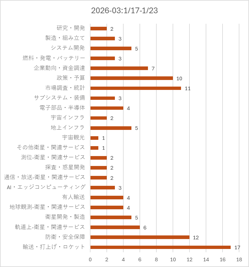 防衛・安全保障(12件) 記事数は2位。特筆すべきは米宇宙軍の「商用デオービット発注」である。これは防衛当局がハードウェアを所有するだけでなく、軌道上の維持管理業務を「サービス(DaaS)」として民間から購入する流れが定着しつつあることを示している。