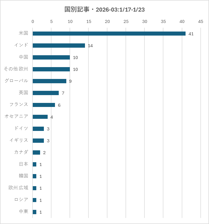 🇺🇸 米国(41件):圧倒的なエコシステム アルテミス(NASA)、テスラ・SpaceX(民間)、宇宙軍(防衛)と、全てのセクターでゲームチェンジ級の動きを展開。技術・金融・安保の全方位で他国を圧倒している。