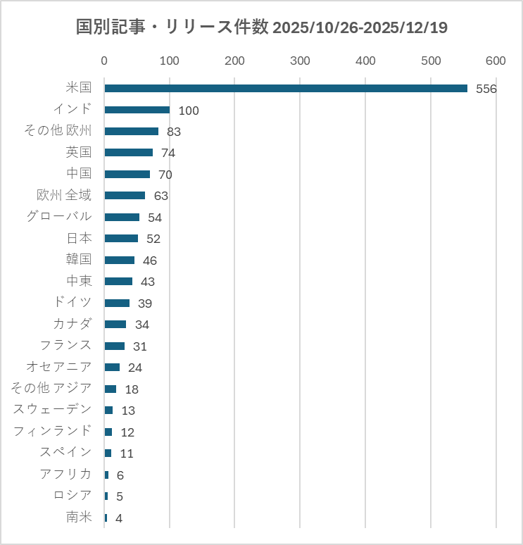 本レポートにおける件数は、活動量や発信頻度の指標であり、各国の市場規模や技術力そのものを直接比較するものではない。