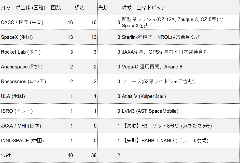 ■ 打ち上げ概況 2025年12月は、世界全体で計40回(1日あたり1.3回)という、単月としては過去最多級のロケット打ち上げラッシュとなりました。成功率は95.0%(38勝2敗)と高い水準を維持したものの、その失敗の全てが北東アジア(日本・韓国)で連日発生するという衝撃的な結末を迎えました。