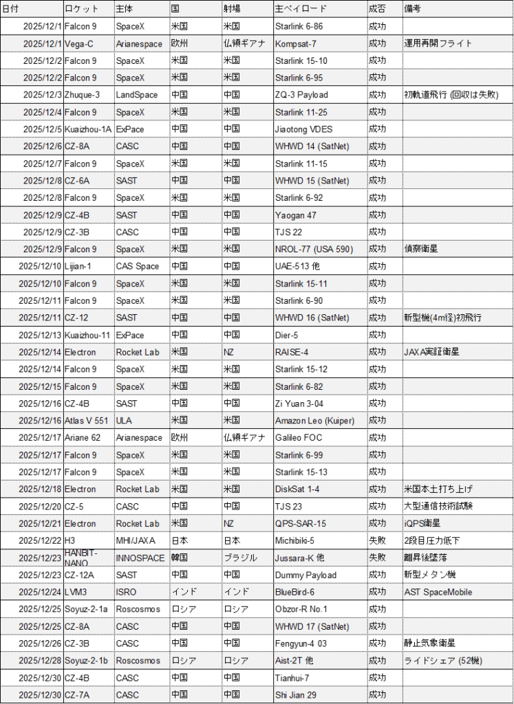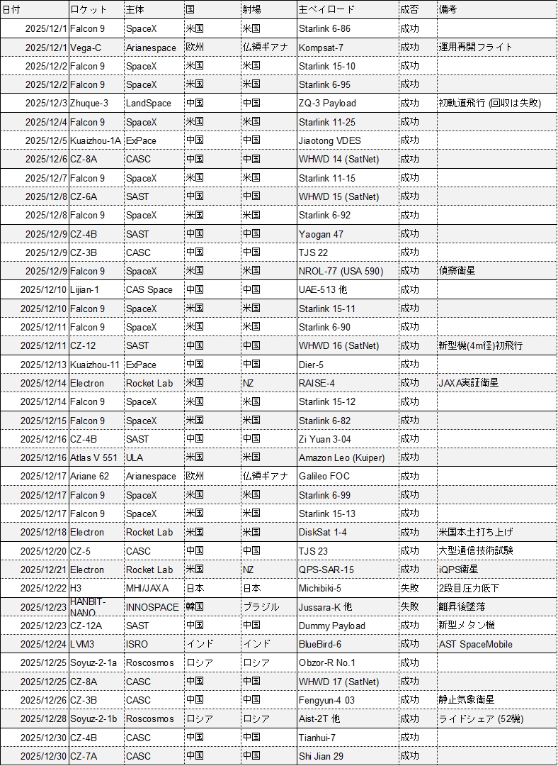 本レポートは、2025年12月に実施された軌道投入を目的とするロケット打上げ(Orbital Launch Attempts)を対象とする。